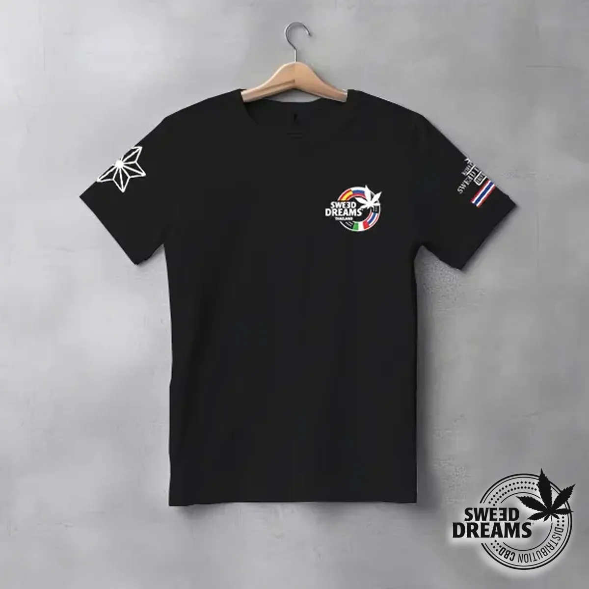 Color Negra de Algodón de alta calidad, Fabricada en Bangkok, estampado blanco con el logo de Sweed Dreams Thai en el frente y en el dorso.